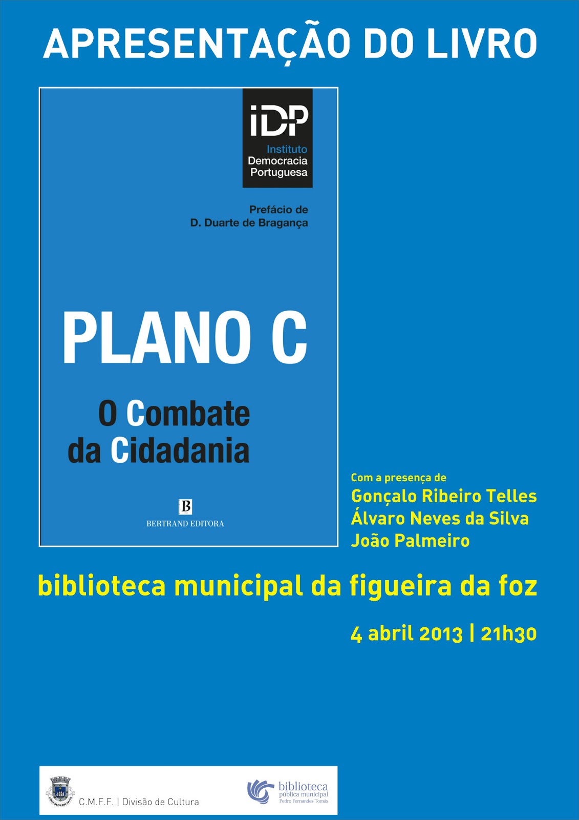 O IDP – Instituto da Democracia Portuguesa, apresenta no próxima dia 4 de abril, 5ª feira, às 21h30, na Biblioteca Municipal da Figueira da Foz, o livro Plano C – o Combate da Cidadania, obra da autoria de 23 associados desta instituição, com prefácio de D. Duarte de Bragança, presidente honorário do IDP.