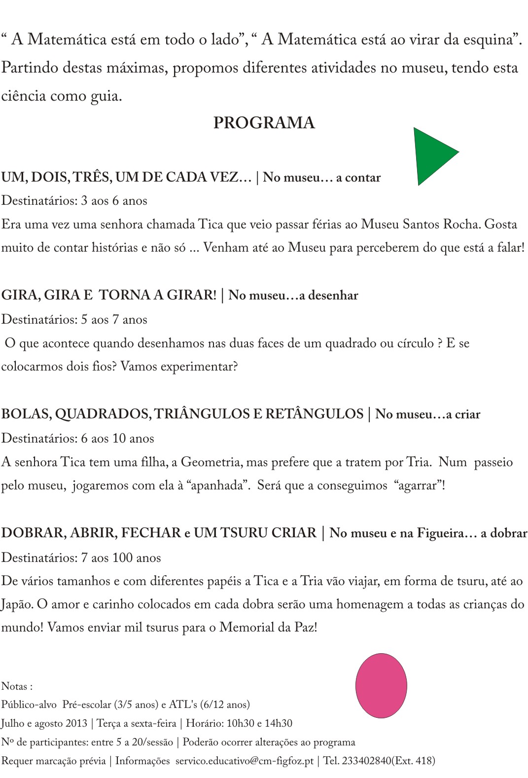 O programa, promovido pela Divisão de Cultura da Câmara Municipal da Figueira da Foz, iniciou-se ontem no Museu Municipal, com a iniciativa Animais à Solta, um momento de diversão e aprendizagem para as 20 crianças participantes, com idades entre os 6 e os 12 anos, e continuará até 6ª feira, dia 13.