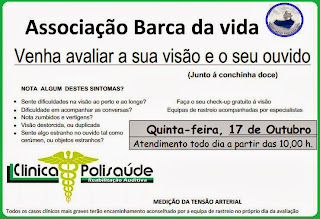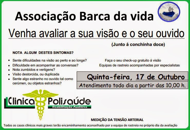 A Associação Barca da Vida -IPSS vai realizar no dia 17 de outubro, das 10h00 às 17h30, rastreios gratuitos aos olhos e aos ouvidos, nas suas instalações. Esta ação é promovida em parceria com a Clinica PoliSaúde que irá disponibilizar técnicos de saúde especializados nestes tipo de check-up visuais e auditivos.